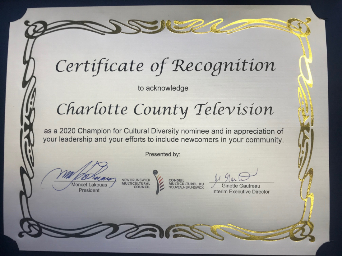 CHCO-TV received a 2020 "Certificate of Recognition" for being a "Champion of Cultural Diversity" from the New Brunswick Multicultural Council for work on programs such as the LJI-funded NBWA: New Brunswickers Want Action, which examines systemic racism in New Brunswick. CHCO-TV was recommended for the award by the Deputy Mayor of Saint Andrews Brad Henderson. Henderson said, "The community and the province of New Brunswick are lucky to have an independent news outlet like CHCO-TV that is willing to provide a platform for important issues and voices in our community. It is for this reason that I nominated CHCO-TV for this recognition award."